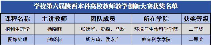 近日,陕西省教育厅公布了第六届陕西本科高校教师教学创新大赛结果,我校环境与生命科学学院教师杨晓菲、教育科学学院教师熊晓莉分别荣获二等奖。