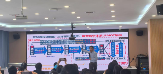 培训会上,周屈兰教授以专业视野为引,简明扼要梳理世界高等教育数字化的发展脉络,为全体参训教师搭建起清晰的认知框架。接着,围绕智慧课程建设核心议题,从四大维度展开深度剖析:第一,聚焦智慧课程的图谱化技术基座,详解教学内容颗粒化、学习路径可视化等关键技术要点;第二,构建“三环AI工具驱动课程架构”,结合数智教学体系LPMOT架构,生动演示从“学的执行”到“学情感知”,再到“数据挖掘、模型优化、教的执行”的全流程闭环,直观呈现AI对传统混合教学的赋能升级;第三,分享AI赋能课堂交互的丰富实践案例,以及课程任务引擎的具体应用场景,展现AI在辅助课堂学习、提供个性化支持、优化教学反馈等方面的实用价值;第四,结合自身教学实践,提出借助AI工具适配不同教学场景,高效达成知识目标、能力目标与素质目标的多元路径。